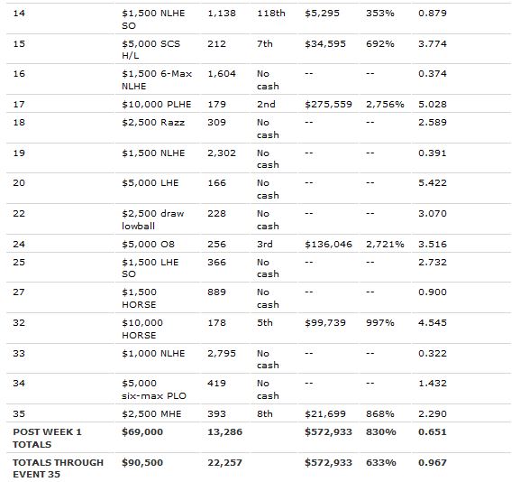 Efter en sløj start (se screenshot herunder) fik Phil Ivey nemlig fat i årets World Series Of Poker. Armbåndet har været så tæt på to gange, men i alt har han ramt fem finaleborde – og de kom faktisk inden for 12 dage.