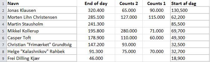 Jonas “Tulkaz” Klausen begyndte dagen med det bedste udgangspunkt, da han havde spillet startstacken på 30.000 op i 130.500 før dagens spil. Og det var da også den London-bosatte dansker, der sluttede andendagen af med at putte flest chips i posen blandt de danske spillere, men kun på grund af en sublim slutspurt. I løbet af de sidste tre hænder tog han nemlig to modstandere ud, og lukkede og slukkede dermed i 320.400 chips.